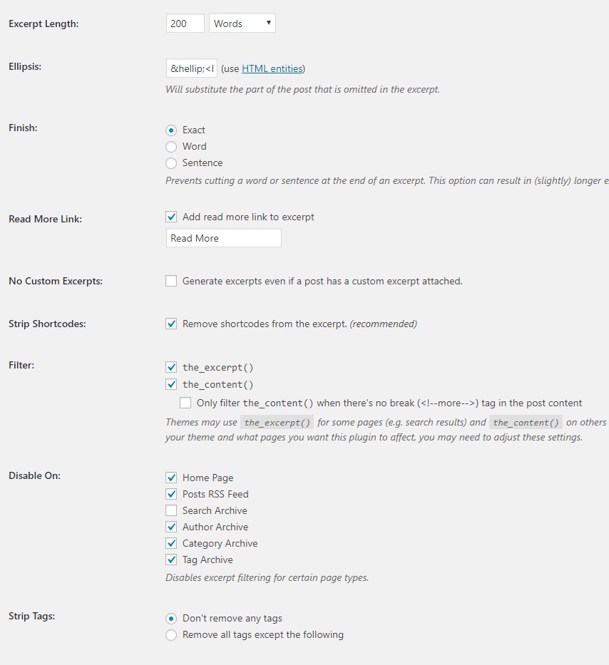Below is a screen shot of the various settings. Important parameters include number of excerpt words or characters, selective disable for specific archive templates and termination options.